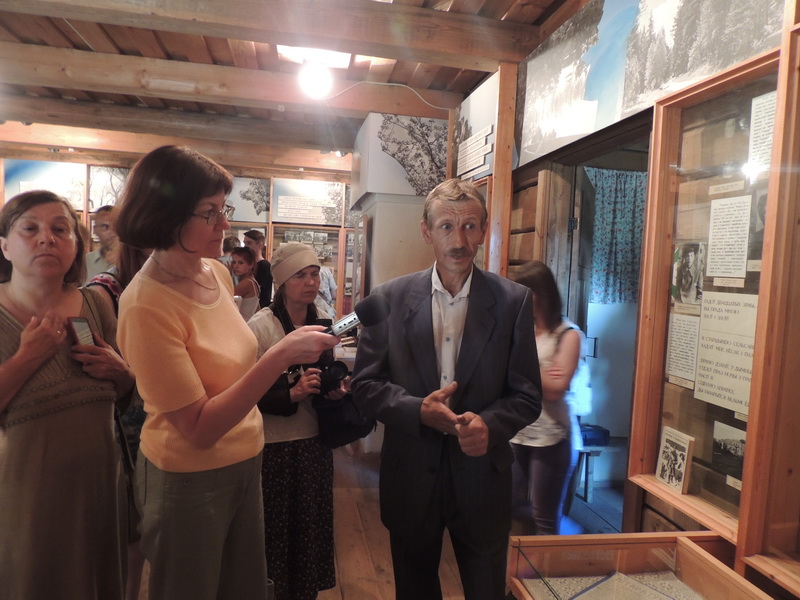 Нас сустракае мужчына ў касцюме — гэта Міхаіл Леанідавіч Сыс — чалавек, які цяпер загадвае домам-музеем у Пуцілкавічах.