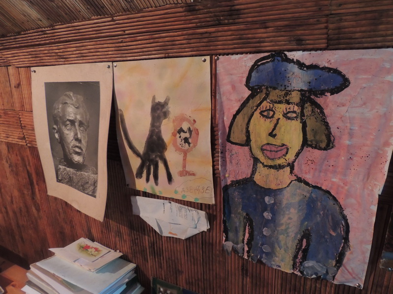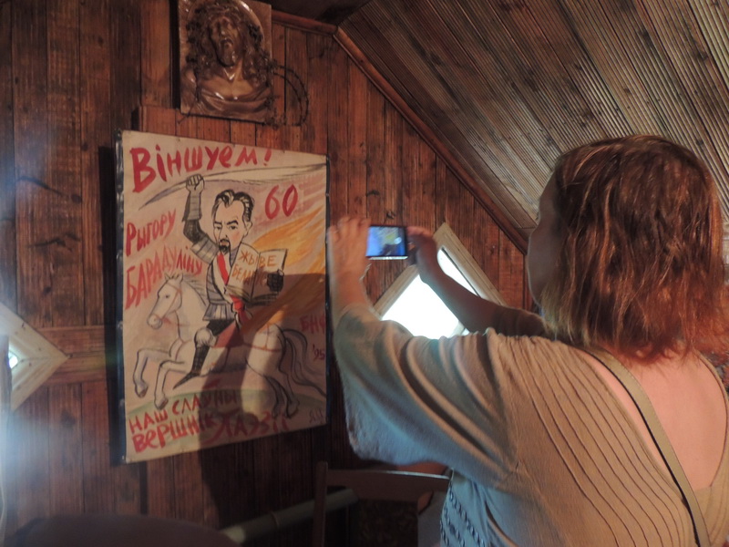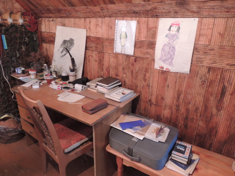 Можна разглядаць кнігі, браць у рукі розныя прадметы побыту, вывучаць дзіўныя малюнкі на сценах — гэта стварае асаблівую атмасферу. Як быццам ты заскочыў да знакамітага творцы ў госці, а ён выйшаў на пару хвілін заварыць гарбату. На сцяне вісяць футравыя зімовыя шапкі — дзяўчыны са смехам прымяраюць іх, нягледзячы на тое, што ў хаце вельмі горача.
