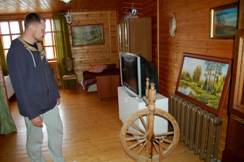 Падымаемся на другі паверх. Тут ёсць камін, старое радыё, калаўрот. Наогул увесь дом апраўлены дрэвам, пакрытым толькі лакам.
