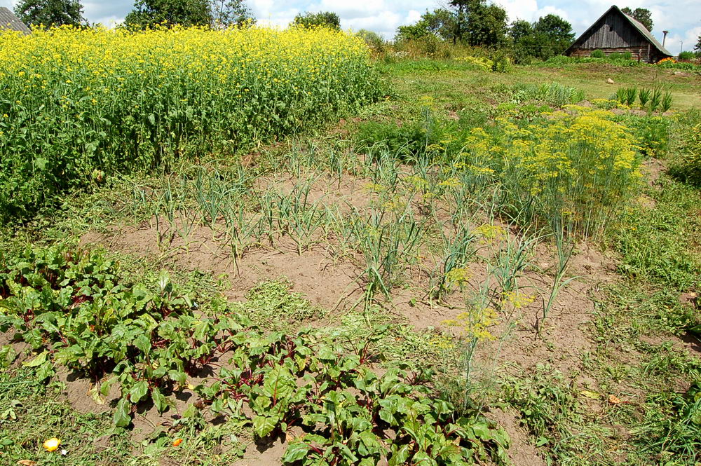 Гарод Любоў Аляксееўна свядома падзяліла на дзве часткі: на “ніжняй” растуць часнок, цыбуля, морква, кроп і пятрушка, на “верхняй” – гуркі, гарбузы, кабачкі ды цэлыя плантацыі розных “айчынных” і “замежных” кветак.