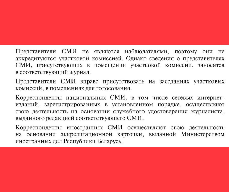 Корреспонденты иностранных СМИ осуществляют свою деятельность на основании аккредитационной карточки, выданной Министерством иностранных дел Республики Беларусь.