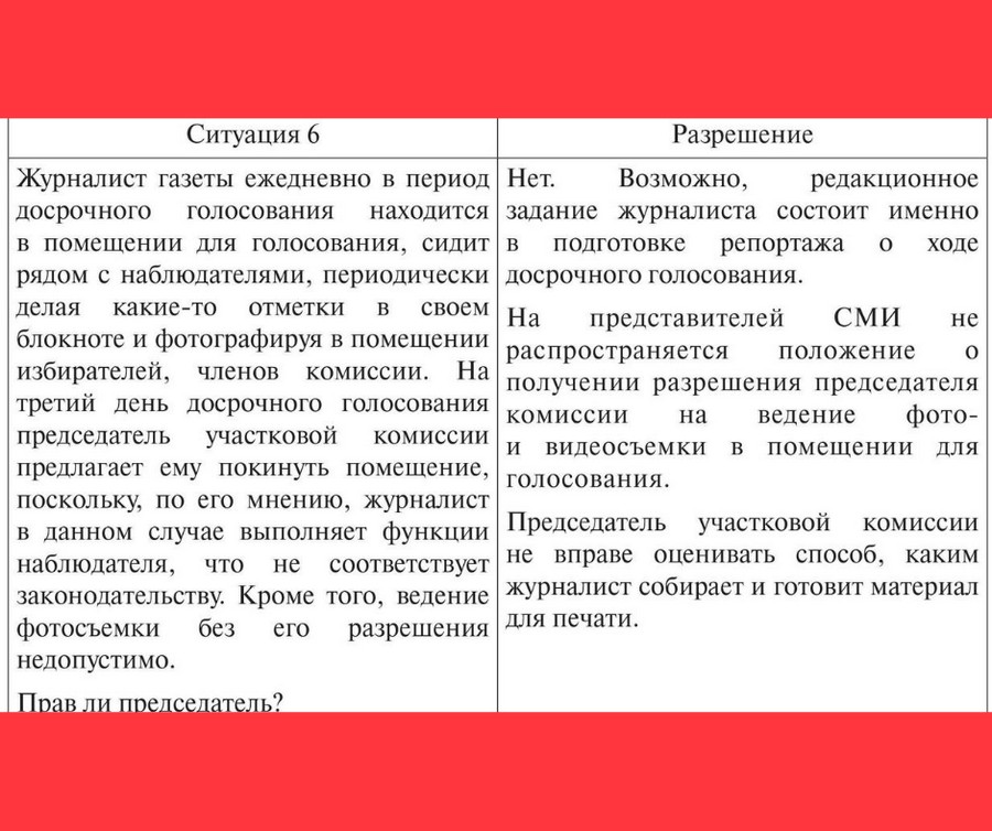 Журналист газеты ежедневно в период досрочного голосования находится в помещении для голосования, сидит рядом с наблюдателями, периодически делая какие-то отметки в своем блокноте и фотографируя в помещении избирателей, членов комиссии. На третий день досрочного голосования председатель участковой комиссии предлагает ему покинуть помещение, поскольку, по его мнению, журналист в данном случае выполняет функции наблюдателя, что не соответствует законодательству. Кроме того, ведение фотосъемки без его разрешения недопустимо.