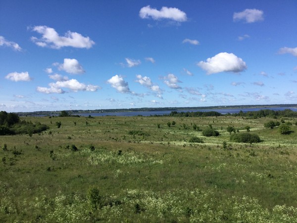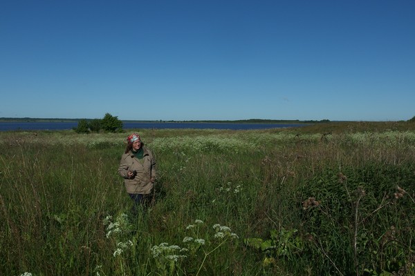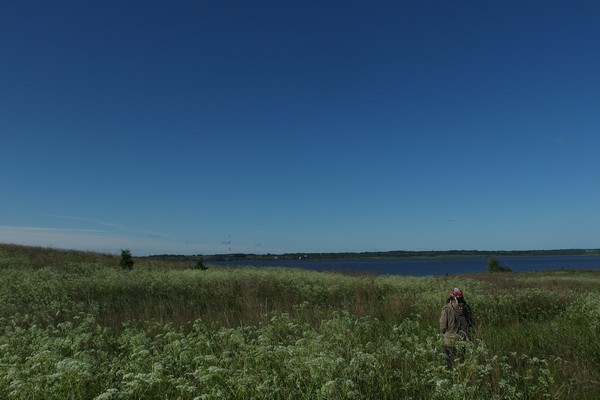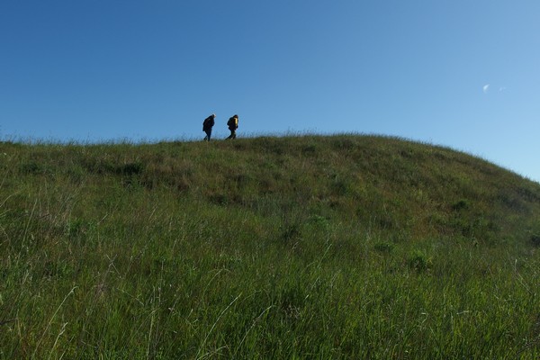 …остров оказался безлюдным — с травой по колено. Шли по утренней росе, ноги промокли за минуты, но об остановке или возвращении не думали — хотелось увидеть как можно больше. Ландшафт необычный — холмы перетекали в равнины. На зеленом море травы кое-где выглядывали низкие кусты.