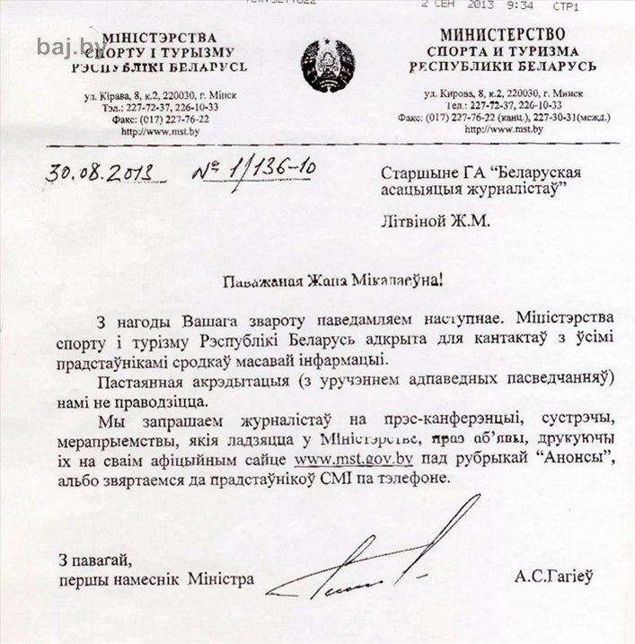 І ўжо зараз ГА “БАЖ” атрымала першыя адказы. Так, напрыклад, Міністэрства спорту і турызму Беларусі за подпісам першага намесніка міністра Аляксандра Гагіева паведамляе, што сталую акрэдытацыю журналістаў ведамства не праводзіць, але адкрытае да кантактаў з прадстаўнікамі ўсіх СМІ.