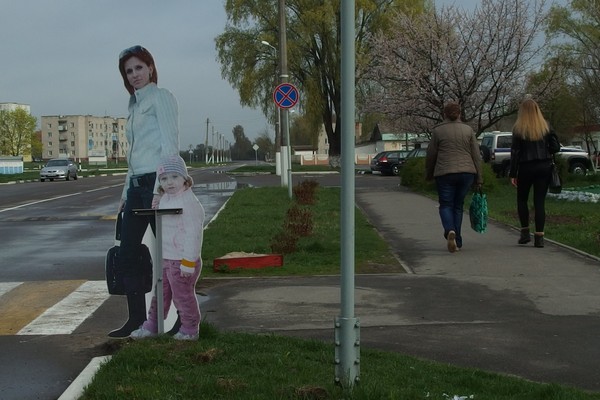 О том, что жизнь продолжается, напоминают фанерные изображения матери с ребенком у пешеходного перехода. Рядом — мемориал в память отселенных деревень. В списке населенных пунктов с удивлением видим Брагин. Как же так, ведь город жив?