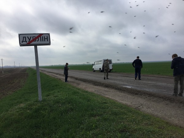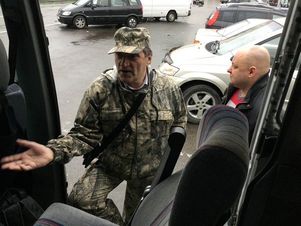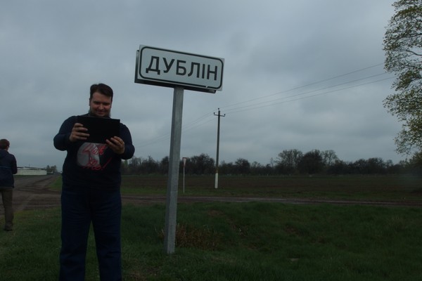 Вадим точен: указатель на Дублин действительно стоит у дороги и селфи уже на планшете. Мои снимки репортажные — люди, микроавтобус, указатель. И невероятно жирные мухи на фото, которых замечаем только в автобусе. «Исход из Дублина, — оптимистично комментирует отъезд Шарипкин, — подальше от чернобыльских мух».