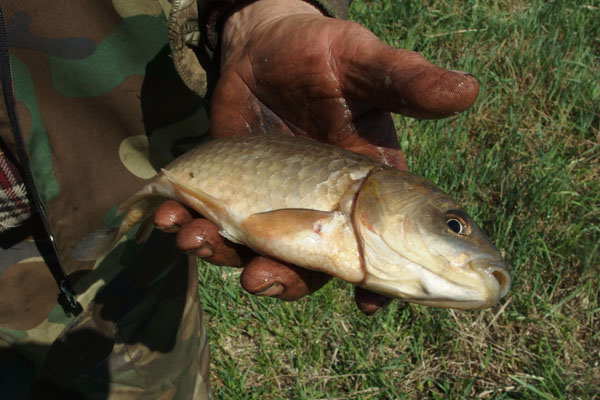 При нас из квадратного искусственного озера хозяин вытаскивает рыбу. Фотоаппараты нацелены на полукилограммового карася. «Хороший карась», — одобряет Шарипкин, а хозяин отвечает: «у нас и получше есть, сейчас покажу».