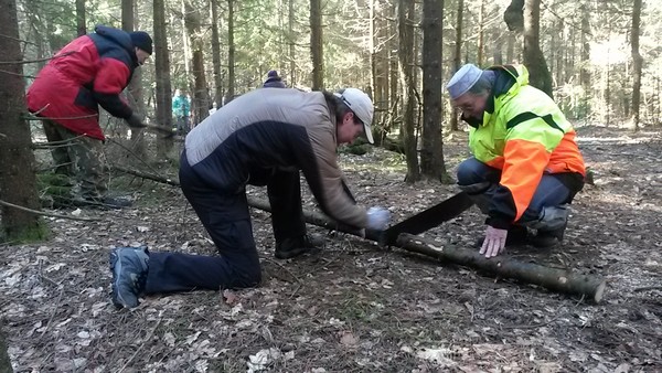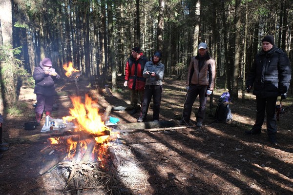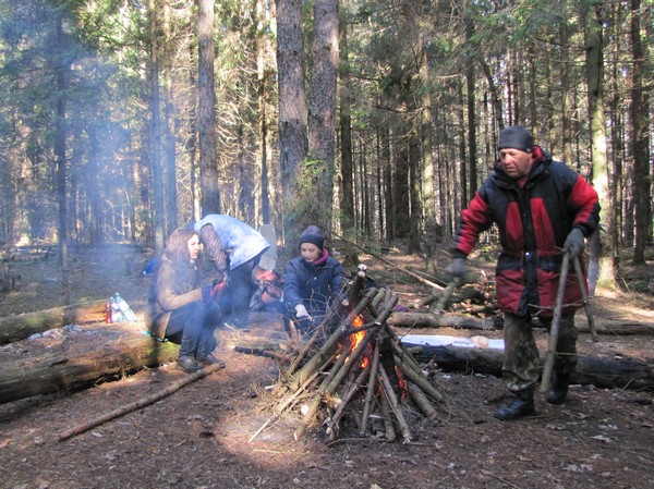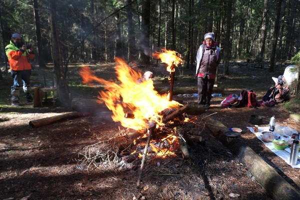 По-настоящему с туристами, экспертами и консультантами мы познакомились через километры пути – на лесной поляне в уже совсем зеленом лесу. Там, сбросив рюкзаки, одни пошли за сухостоем, другие занялись костром, для которого несколько БАЖевцев начали одевать главного героя дня – чучело зимы.