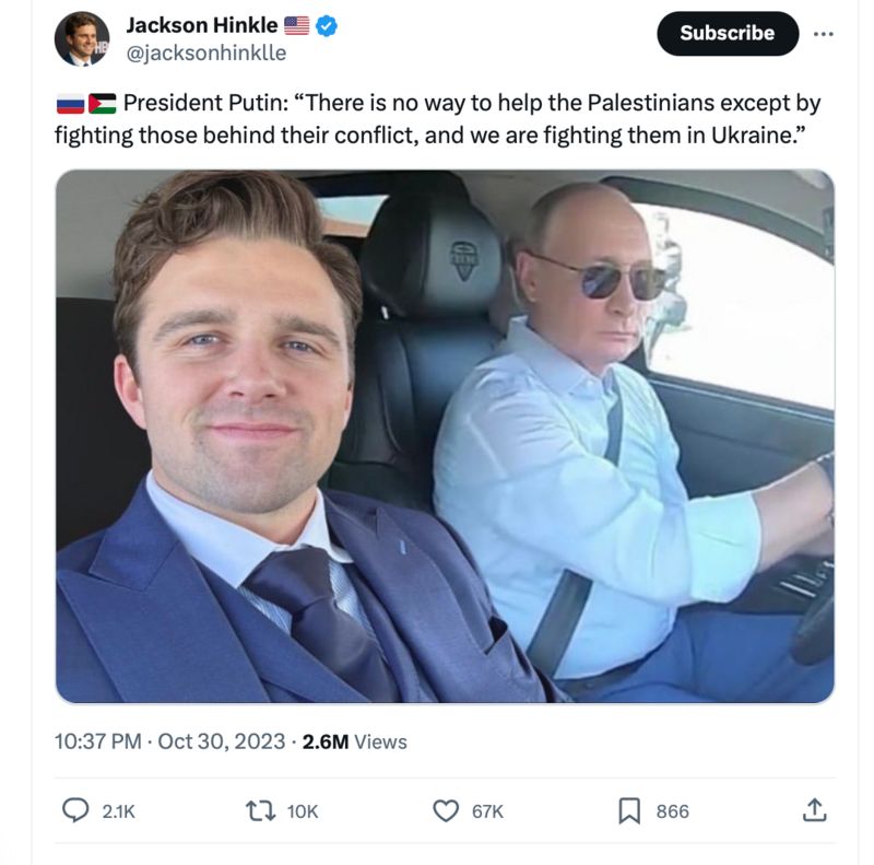 Но после нападения ХАМАС Джексон Хинкл переключился на этот конфликт. Каждый день с начала войны он публикует десятки постов, в которых приравнивает Израиль к «Исламскому государству» и «Аль-Каиде» (обе организации признаны террористическими и запрещены в России и многих других странах мира).