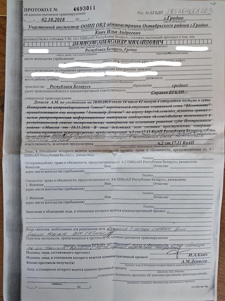 Другога кастрычніка на Дзянісава быў складзены пратакол па частцы 2 артыкула 17.11 КаАП (выраб або распаўсюджванне, а таксама захоўванне з мэтай распаўсюджвання экстрэмісцкіх матэрыялаў, калі ў гэтых дзеяннях няма складу злачынства). Падставай для складання пратаколу стаў перапост на старонцы музыкі ў сацыяльнай сетцы “ВКонтакте” двух відэа з забароненага анархічнага пабліка.