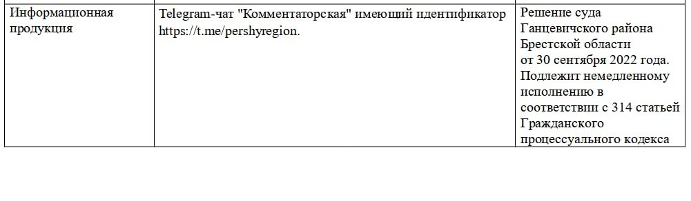 Гэта вынікае з абноўленага Рэспубліканскага спісу экстрэмісцкіх матэрыялаў, дзе з’явіўся запіс, што адпаведнае рашэнне прынятае судом Ганцавіцкага раёна 30 верасня 2022 года і “падлягае неадкладнаму выкананню”.