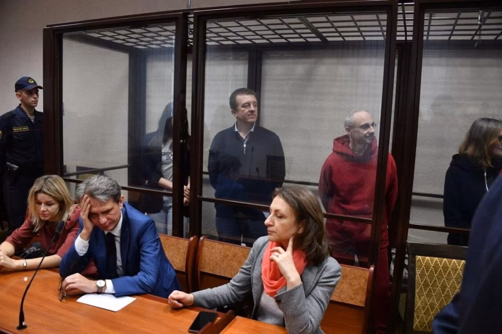 Працэс па «справе БелаПАН». Стаяць Андрэй Аляксандраў (злева) і Дзмітрый Наважылаў, па краях Ірына Злобіна (злева) і Ірына Леўшына. Фота: sputnik.by