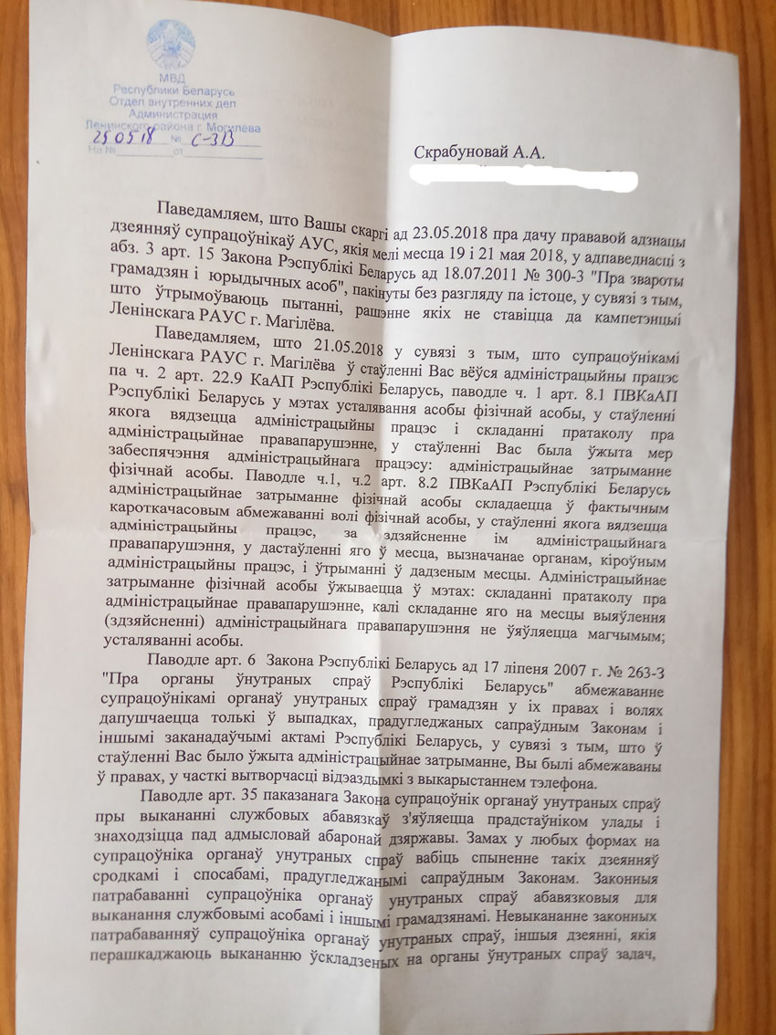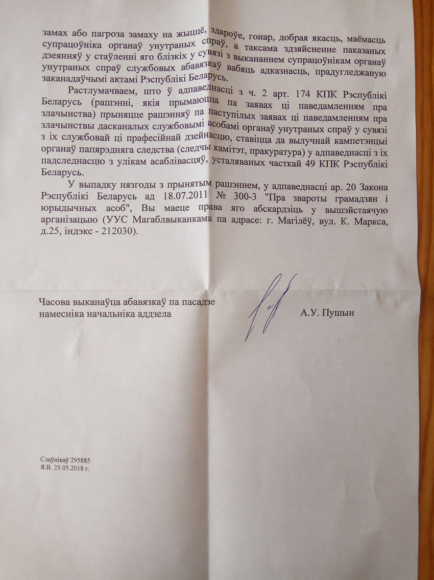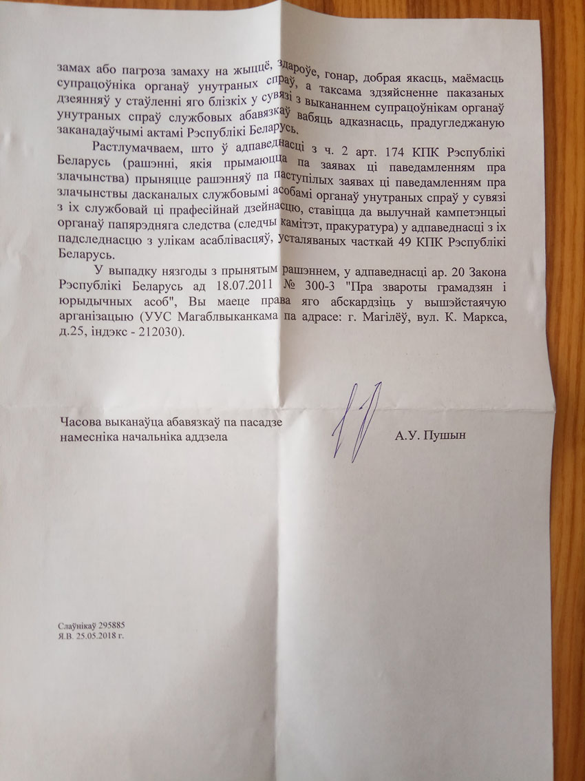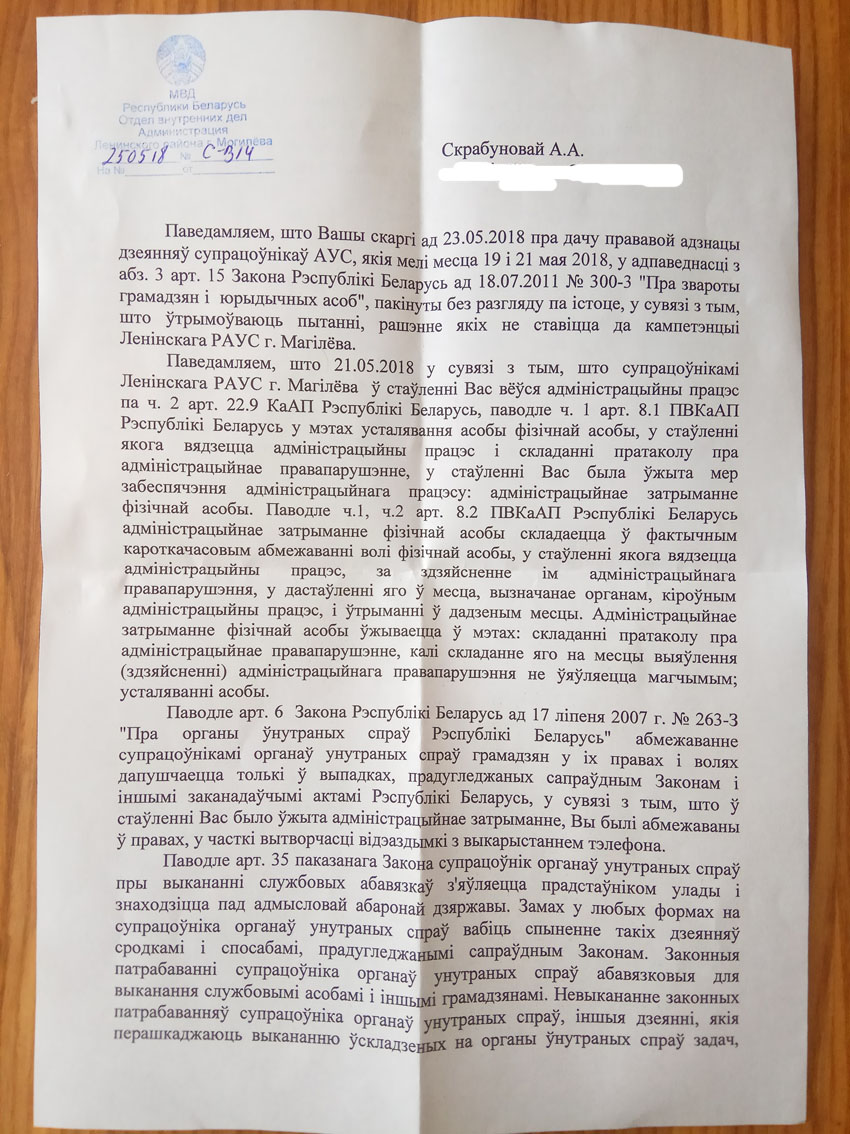 Часова выконваючы абавязкі намесніка начальніка аддзела Ленінскага РАУС Магілёва Аляксандр Пушын даслаў Аліне Скрабуновай два аднолькавыя адказы на дзве розныя скаргі, якія журналістка накіравала 23 мая на імя начальніка РАУС Аляксея Шчэрбакова.
