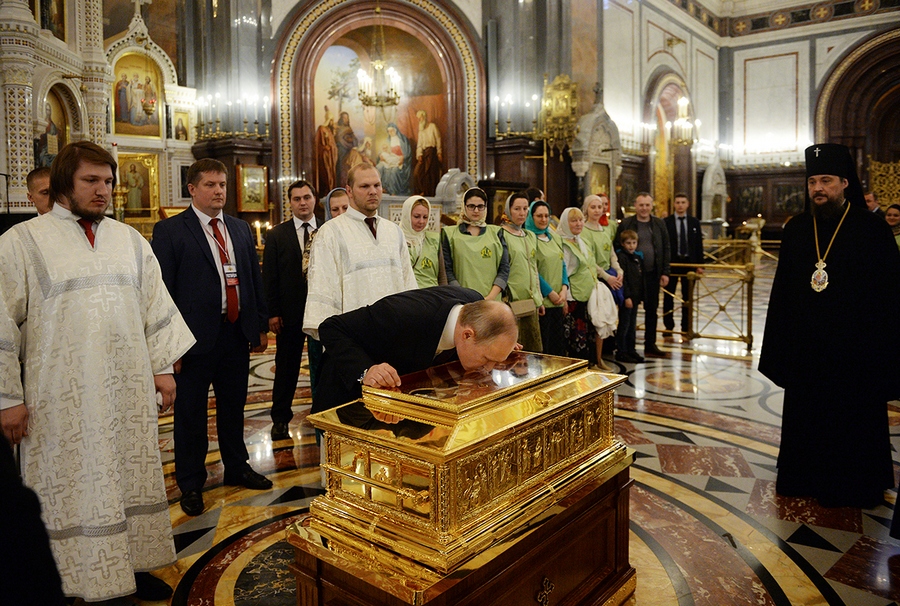 Путин в фильме тоже сказал много важного. Во-первых, что коммунистическая идеология сродни христианству. Во-вторых, что «Кодекс строителя коммунизма» — это Библия, только примитивная. В‑третьих, что мумия Ленина в Мавзолее ничем не отличается от святых мощей. Меня как человека неверующего эта еретическая чушь только позабавила. Не менее забавно то, что ведомство Гундяева и вся эта толпа хоругвеносцев и царебожников, слушая президента, впавшего в ересь, не отлучает его от церкви, не предает анафеме, не вопит об оскорблении своих тонких религиозных чувств. Хотя соответствующая статья 148 УК РФ на лбу Владимира Путина проступила вполне отчетливо.