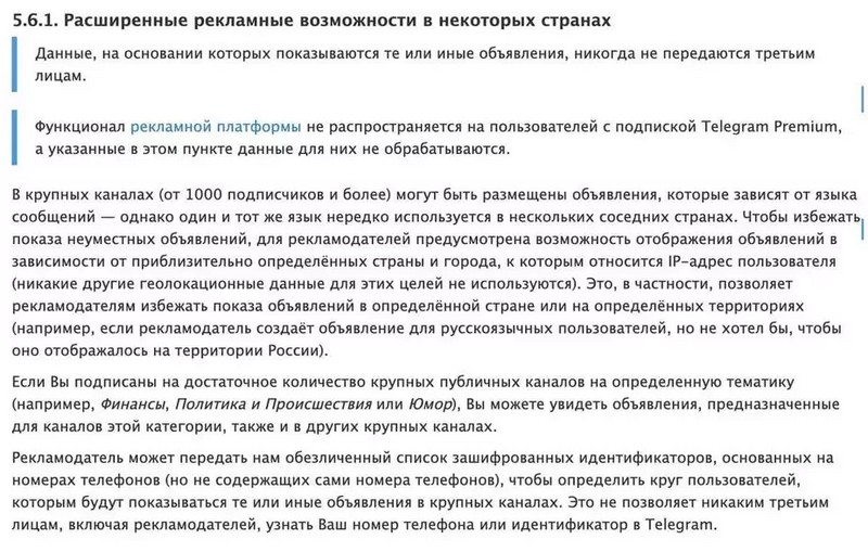 У Telegram абнавілася палітыка прыватнасці. У некаторых краінах, у тым ліку ў Беларусі, там з’явіўся пункт 5.6.1. У ім сказана, што цяпер Telegram будзе перадаваць рэкламадаўцам IP-адрасы, сферу вашых цікаўнасцяў і зашыфраваны нумар тэлефона ў выглядзе ўнікальнага ідэнтыфікатара (кампанія запэўнівае, што ён зашыфраваны надзейна).