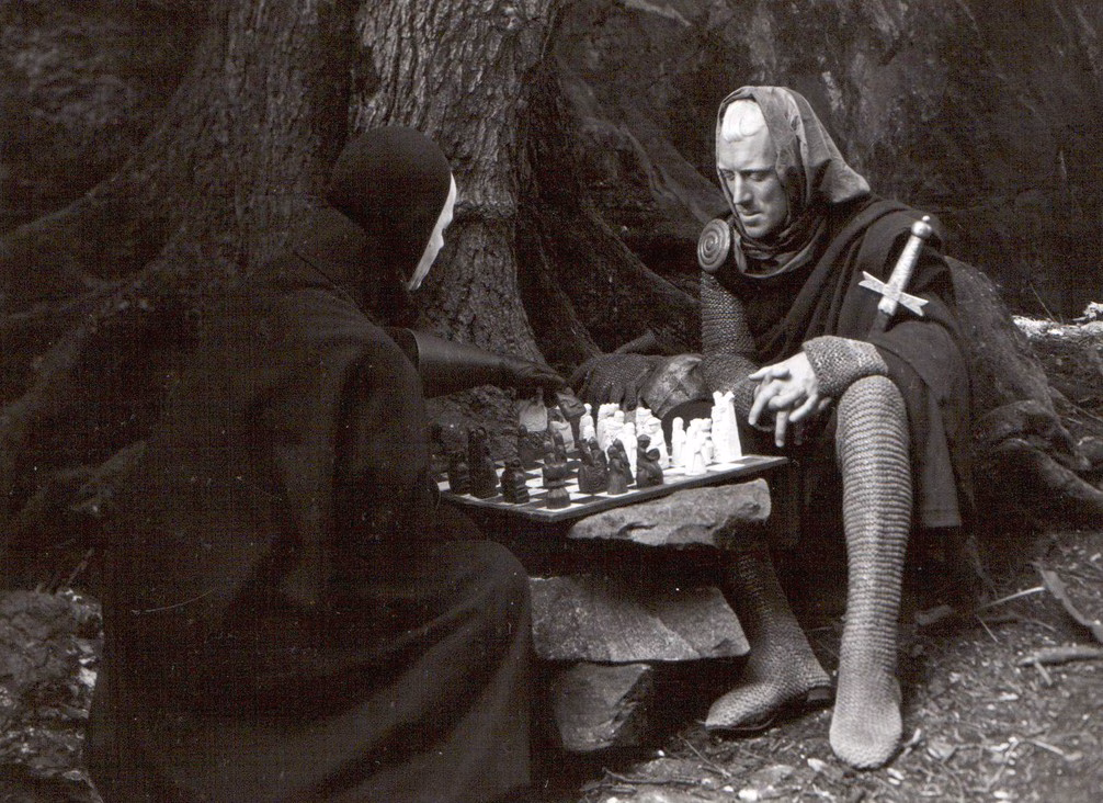 Рыцар сустракае Сьмерць і кідае ёй выклік: згуляць партыю ў шахматы на сваё жыцьцё. Сьмерць, вядома, згаджаецца: хто зь людзей можа быць ёй супернікам.