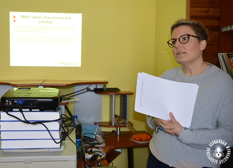 Пасля прэзентацыі гендарных даследаванняў, шведская журналістка правяла практычны занятак па напісанні матэрыялаў для СМІ у адпаведнасці з гендарнымі нормамі мовы.