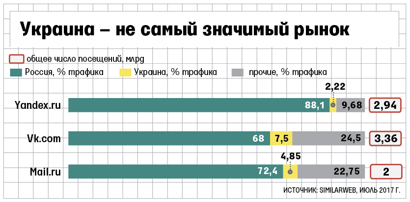 Статистика SimilarWeb также подтверждает, что Украина остается для «Яндекса» и сервисов Mail.ru Group вторым по размеру источником трафика после самой России. SimilarWeb, отмечают «Ведомости», фиксирует заходы с украинских IP-адресов — без использования программ для обхода блокировок.