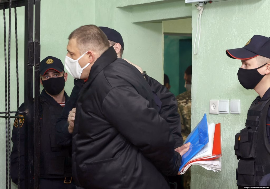 Сяргей Ціханоўскі падчас турэмнага працэсу, сьнежань 2021 году