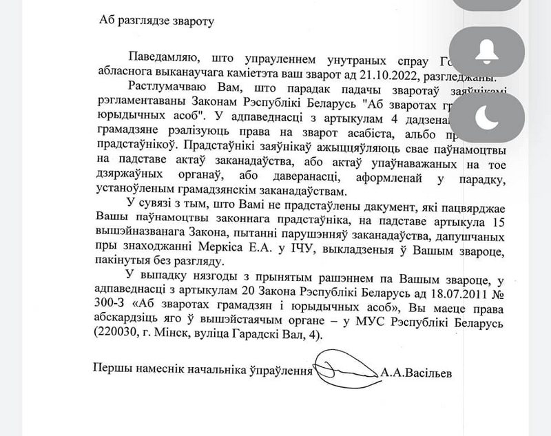 “Паскардзілася ў кіраўніцтва МУС, што лісты ў СІЗА да Яўгена Меркіса не даходзяць ні ад каго (уключна мяне), апроч бацькі. А мне адказалі, што, я не ягоны законны прадстаўнік, таму, і зварот мой разглядаць ня будуць…”, — зазначае Ларыса Шчыракова на сваёй старонцы ў сацсетцы Фэйсбук.