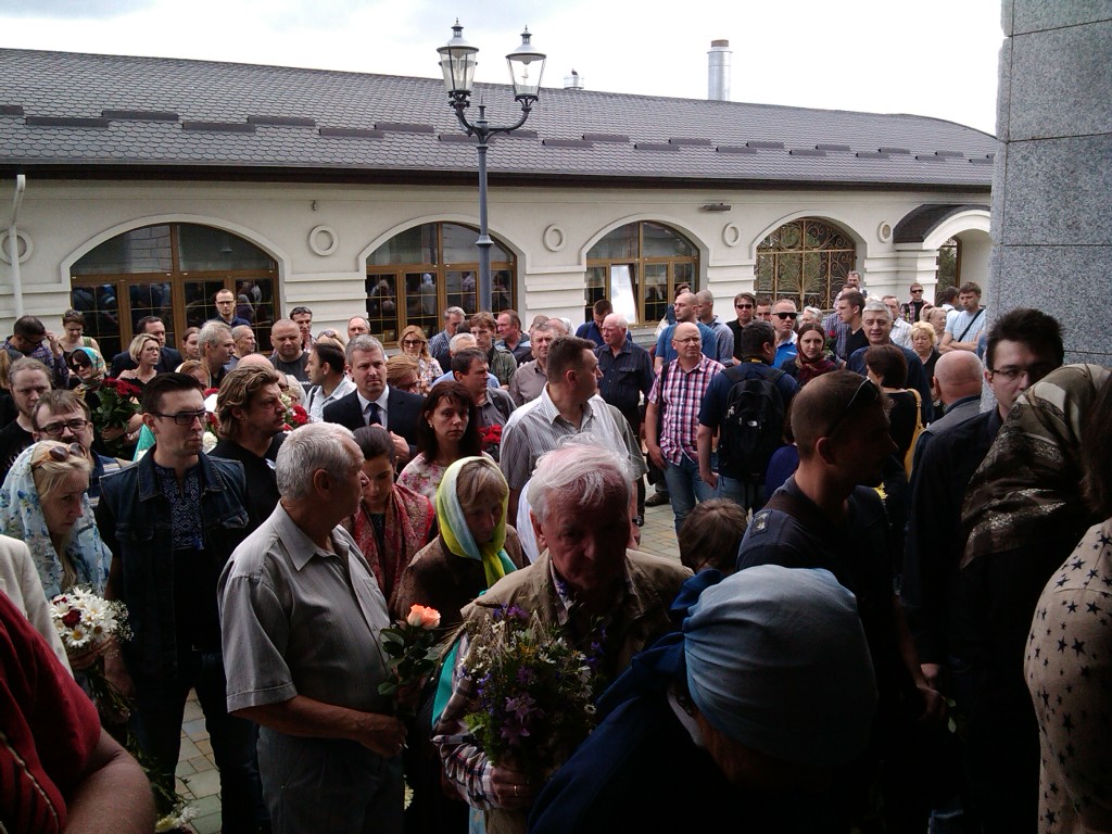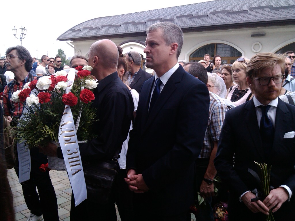 У храме каля труны з целам Шарамета знаходзіліся грамадзянская жонка Паўла Алена Прытула, украінскі журналіст і дэпутат Мустафа Наем, супрацоўнікі амерыканскай амбасады.