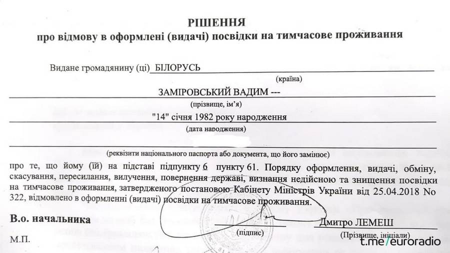Украіна адмовіла ў часовым відзе на жыхарства фатографу "Тутбая" Вадзіму Заміроўскаму. Аднак пазней рашэнне было зменена на пазітыўнае.