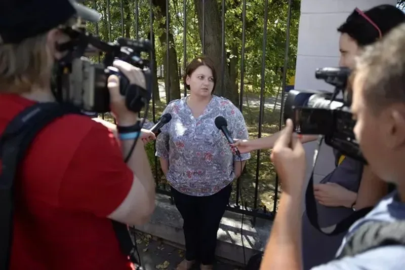Журналістка БелаПАН Таццяна Каравенкова каля Следчага камітэта. Фота: Сяргей Балай