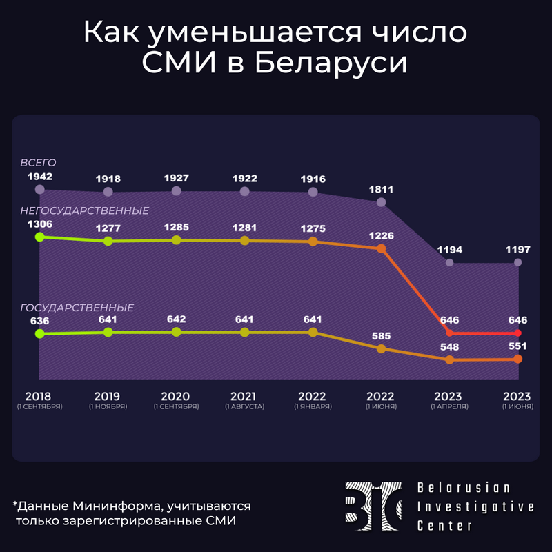 Аднак гэтым лічбам, як і рэжыму Лукашэнкі, даверу ніякага. Беларускі раследвальніцкі цэнтр (БРЦ) падлічыў, што з сярэдзіны 2022 года Беларусь згубіла больш за трэць зарэгістраваных СМІ.