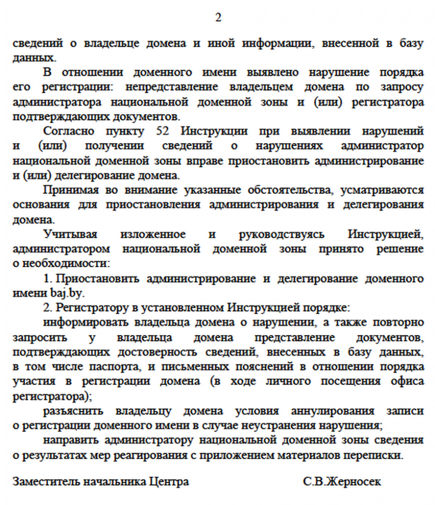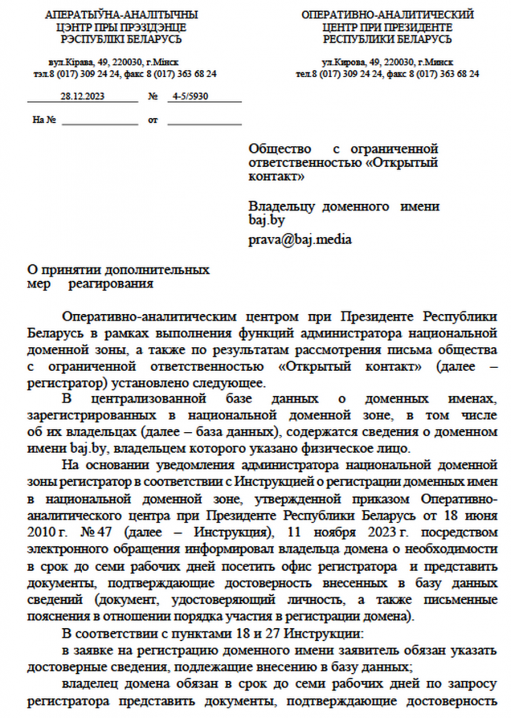 3 студзеня Аператыўна-аналітычны цэнтр пры прэзідэнце Беларусі ажыццявіў рашэнне прыпыніць дэлегаванне даменнага імя Baj.by яго ўласніку нібыта ў сувязі з выяўленымі парушэннямі.