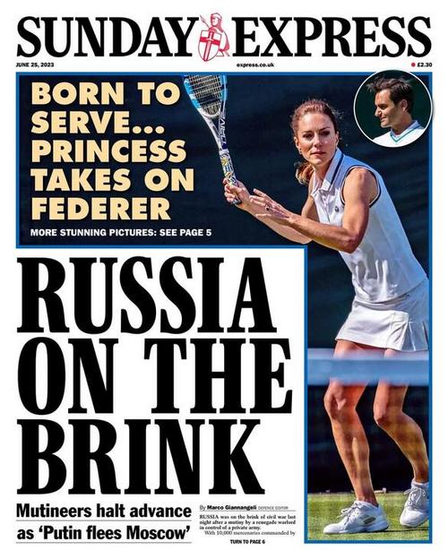 «Прошлой ночью Россия оказалась на грани гражданской войны, после того как опальный начальник частной военной компании, поднял бунт», — пишет британский The Sunday Express. Посвященный Пригожину заголовок делит первую полосу с анонсом статьи о Кейт Миддлтон, которую вызвал на теннисный матч Роджер Федерер.