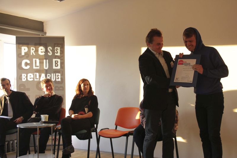 У намінацыі “Пачынаючы журналіст” дыплом і сертыфікат на суму 300 еўра быў уручаны расійскай журналістцы Таццяне Дворнікавай за тэкст “Моўны бар’ер”, які апублікаваў “Коммерсант – Власть”.