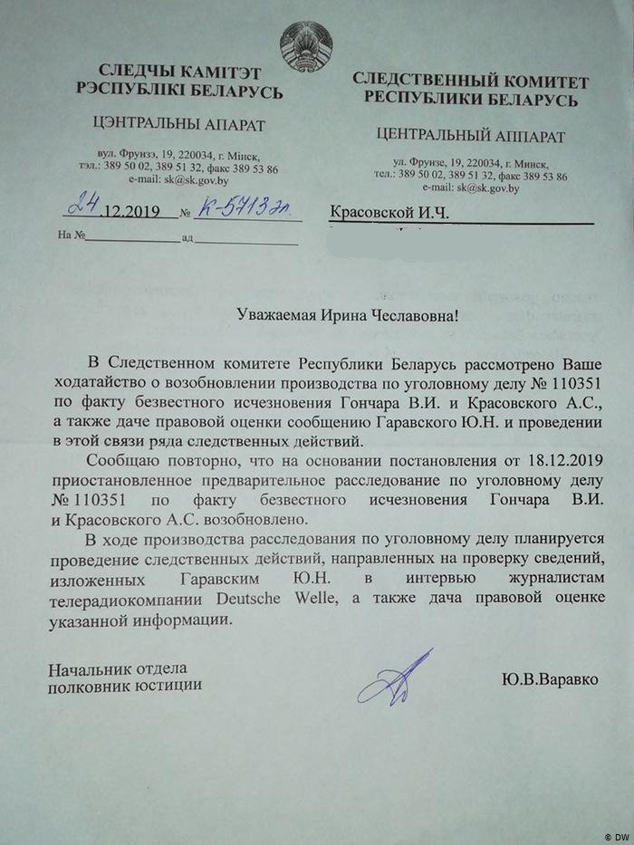 Следственный комитет (СК) Беларуси возобновил предварительное расследование по факту исчезновений 16 сентября 1999 года экс-главы Центризбиркома Виктора Гончара и поддерживавшего оппозицию бизнесмена Анатолия Красовского. Об этом в среду, 15 января, сообщила DW Ирина Красовская. 22 декабря прошлого года она направила электронное ходатайство в СК с требованием возобновить приостановленное следствие в связи с заявлениями Юрия Гаравского.