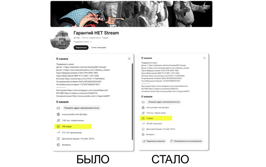 Гомельчанин Максим Филипович вынужден был удалить (или же отправить в закрытый доступ) сотни своих видео после выхода из ИВС. Зачистка коснулась каналов Гарантий Нет, Гарантий Нет Stream, также пропала и страничка Филиповича в Инстаграм. На его страницах стали недоступны записи «тунеядских протестов», сотни его домашних и уличных стримов.