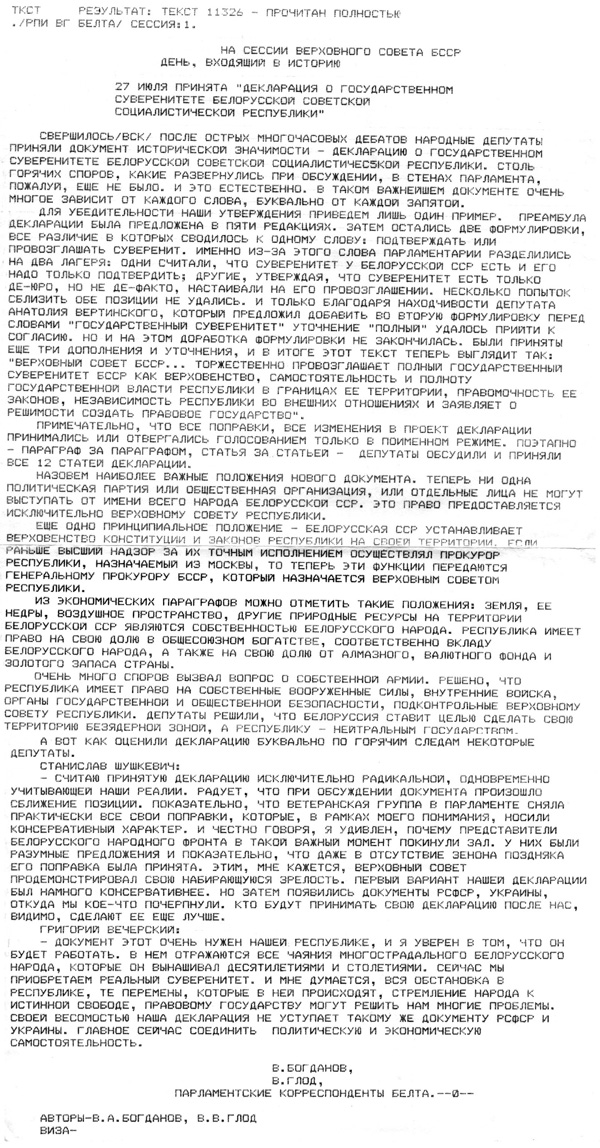 Своей лучшей журналистской работой считаю небольшое сообщение, в котором мы с Владимиром Глодом первыми рассказали миру о принятии Декларации о суверенитете БССР.