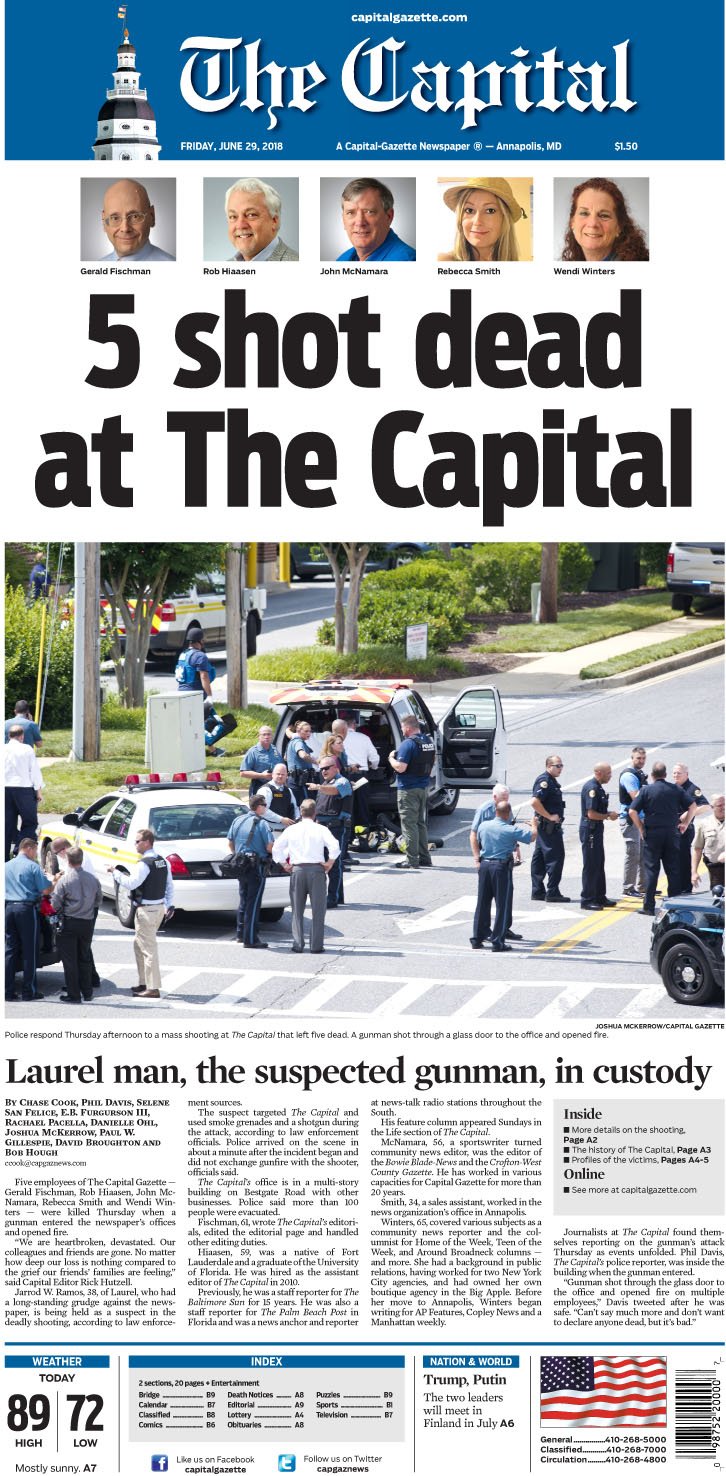 В редакции газеты Capital Gazette в американском штате Мэриленд произошла стрельба, неизвестный убил не менее пяти человек. В полиции не считают произошедшее терактом.