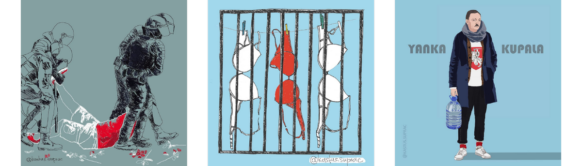 Ілюстратар, што падпісваецца як Кастусь Супраць, летам мінулага года завёў старонкі ў розных сацыяльных сетках, каб публікаваць свае водгукі на рэчаіснасць. Там размяшчаюцца плакаты для акцый, карыкатуры на рэжым, ілюстрацыі на тэму беларускай культуры, беларускамоўныя мемы — і ўсё прынцыпова адкрыта для спампоўвання. «Гэта мой супраціў рэжыму як мастака і як чалавека», — кажа Кастусь.