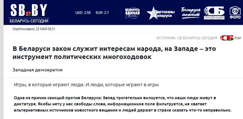 Вот главная государственная газета — «СБ-Беларусь сегодня», в прошлом «Советская Белоруссия», по-народному «Совбелия». Берешь произвольный номер или открываешь ее сайт в интернете — и читаешь заголовки: «Вместе нам по плечу любое санкционное давление», «Работа на результат», «Как в регионах выполняется требование президента увеличить использование вторсырья» (про вторсырье, кстати, — в рубрике «Эксклюзив»), «В согласии с природой», «Проблемы есть, но мы справимся», «В детях наше будущее», «Вернемся к истокам», «Акцент на воспитании патриотов».