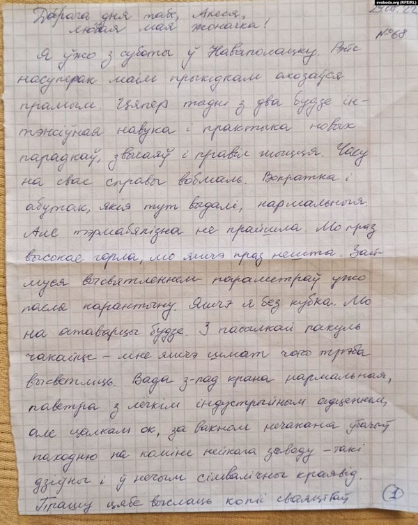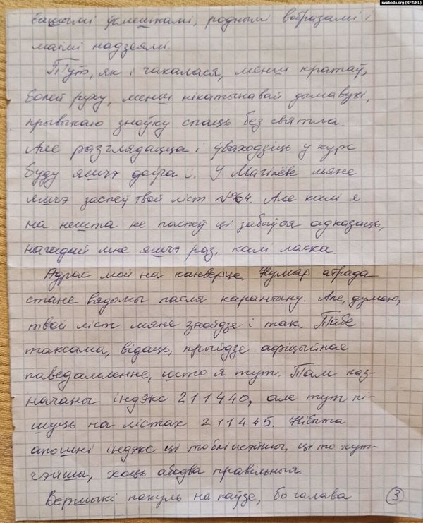 «Пакуль падаецца, што я немагчыма далёка ад вас. Але ж розумам ведаю, што гэта ня так. Бачыў усьмешкі, бачыў нізкія беларускія аблокі, неўзабаве пабачу вашы лісты. А цёплыя ўспаміны і сьветлыя думкі пра вас падтрымліваюць мяне і вабяць у шчасьлівую нашу будучыню», — піша Андрэй.