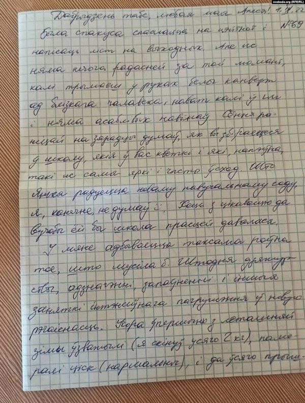 Была спакуса спаслацца на цэйтнот і напісаць ліст на выходных. Але ж няма нічога радасьней за той момант, калі трымаеш у руках белы канвэрт ад блізкага чалавека, нават калі ў ім няма асаблівых навінаў. Сёньня раніцай на зарадцы думаў, як вы зьбіраецеся ў школу і які ня самы яркі і чысты ўсход, — піша Андрэй жонцы Алесі, дачцэ Яніне і сыну Мацьвею.