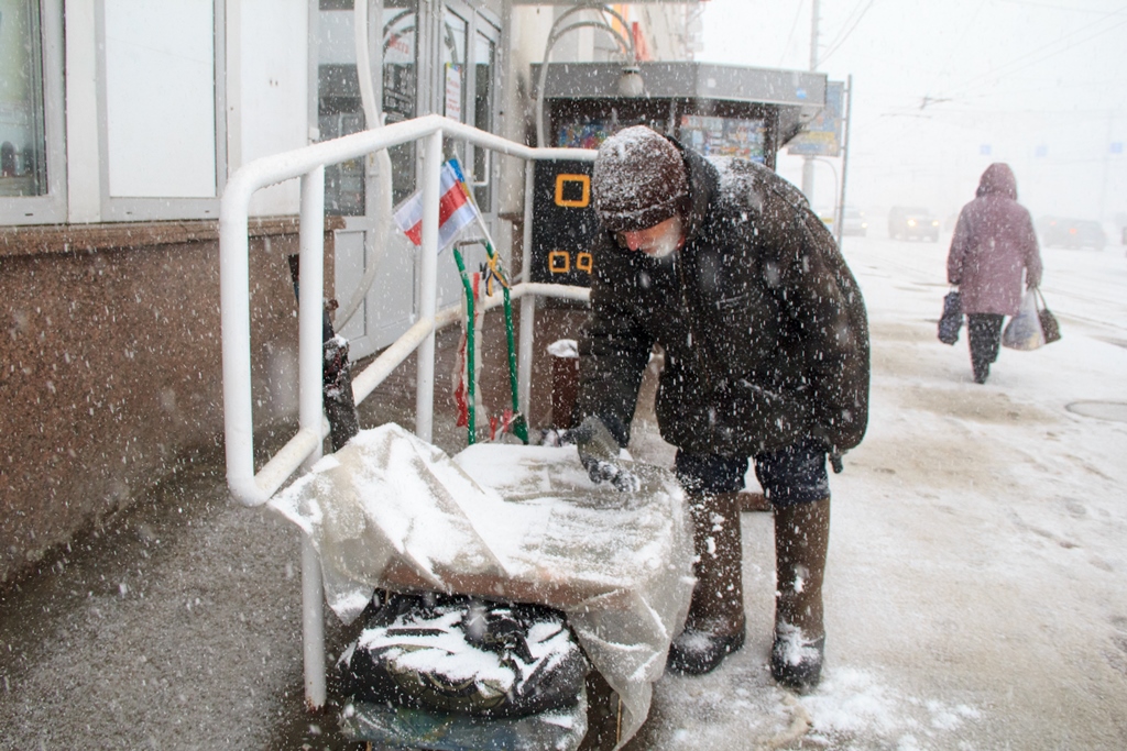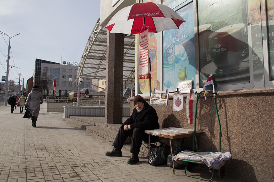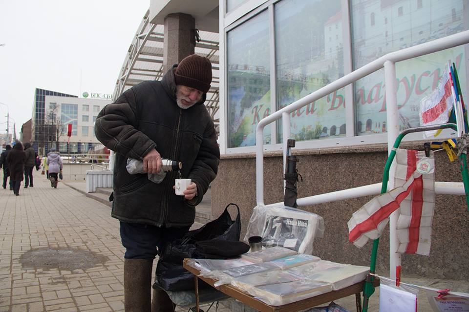 Бел-чырвона-белы парасон над столікам распаўсюдніка відаць здалёк, спадар Барыс штодня прыходзіць да так званага “сіняга дому” на вуліцы Леніна, і гараджане ўжо добра ведаюць гэтае месца. Тут можна паразмаўляць пра палітыку, абмеркаваць апошнія навіны, набыць часопіс або газету. Многія гараджане нават сустрэчы прызначаюць “каля Хамайды”, бо ён стаў сапраўднай гарадской адметнасцю — чалавек, якога не скарылі арышты і штрафы за распаўсюд вольнага слова. Ён займаецца гэтым у любую пару году, не зважаючы на дождж, снег ці маразы. Менавіта такім Барыса Хамайду  паказаў фатограф Ігар Мацьвееў, правёўшы побач з распаўсюднікам не адну гадзіну…