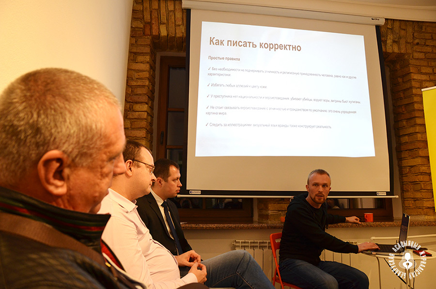«Есть гипотеза Сепира-Уорфа, согласно которой язык определяет мышление. Мы пишем не толерантно, и это транслируется в общество. Люди, которые говорят не толерантно, ведут себя так же. СМИ — локомотив формирования языка. Журналист как минимум должен не порождать язык вражды, не генерировать его. Как максимум, своими материалами с ним бороться, по возможности разрушать стереотипы и снижать градус нетерпимости», — сказал во время встречи активист инициативы Роман Стефаненко.
