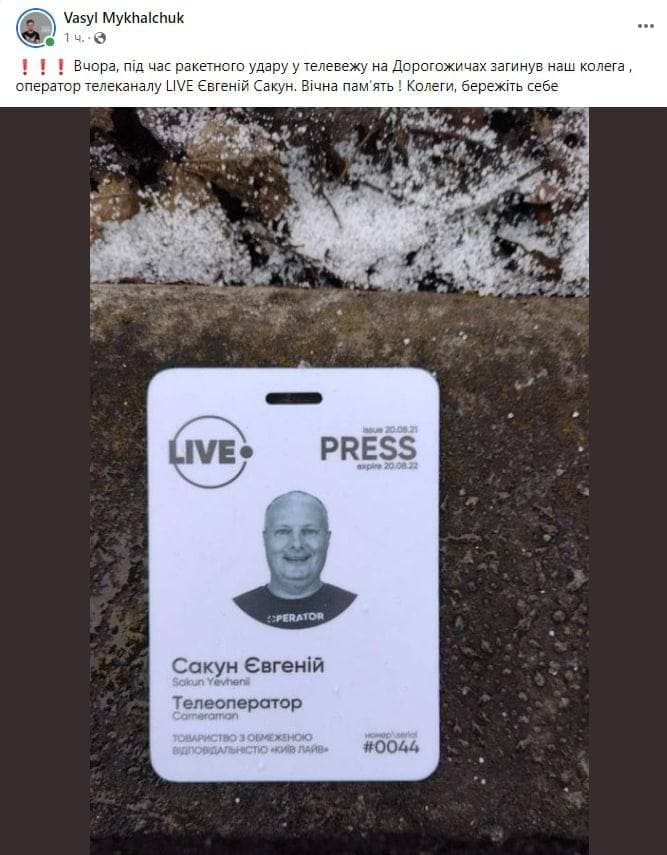 Во время российского ракетного удара по Киевской телебашне погиб Евгений Сакун, оператор канала Киев.Live.