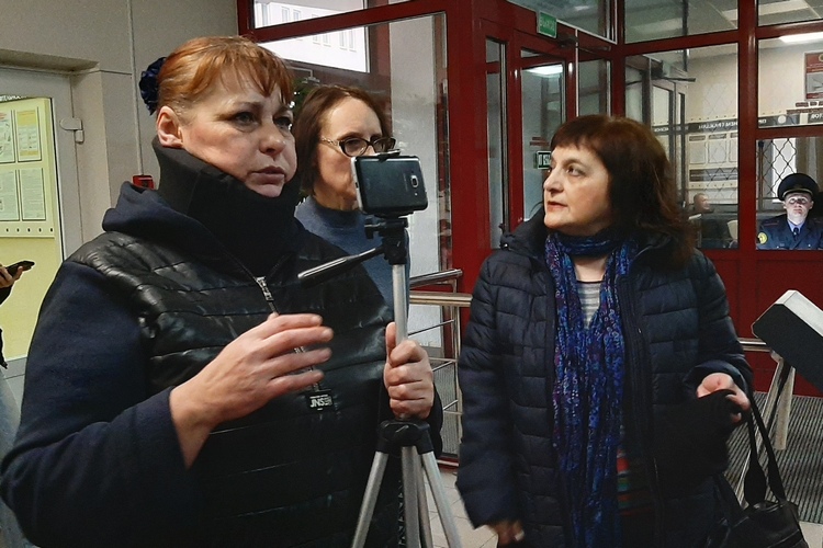 Блогерка, стваральніца відэаканала “Сапраўдная Беларусь” Алена Янушкоўская пачала рабіць відэаздымкі яшчэ ў фае будынка суда. А потым усталявала тэлефон на штатыве ў судовай зале  — каля трыбуны для выступаў.