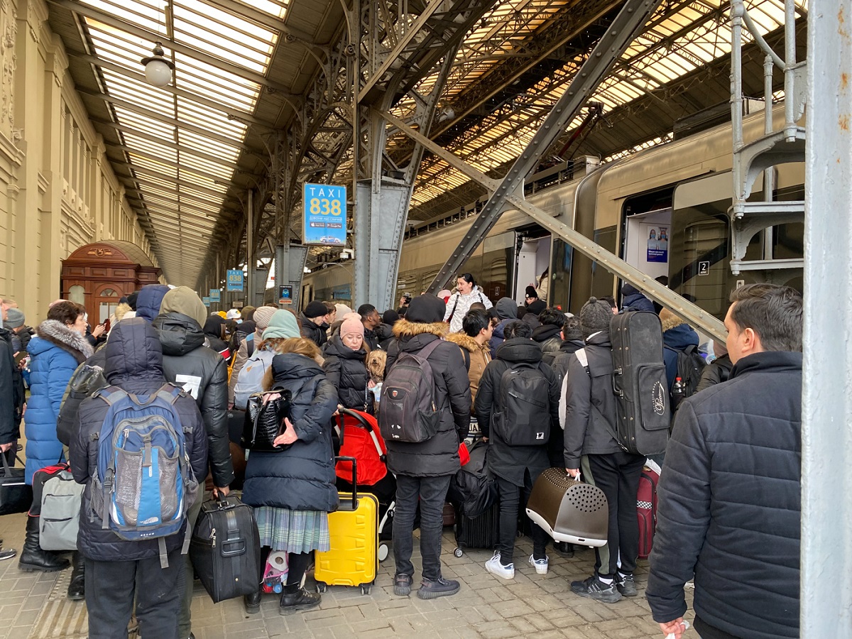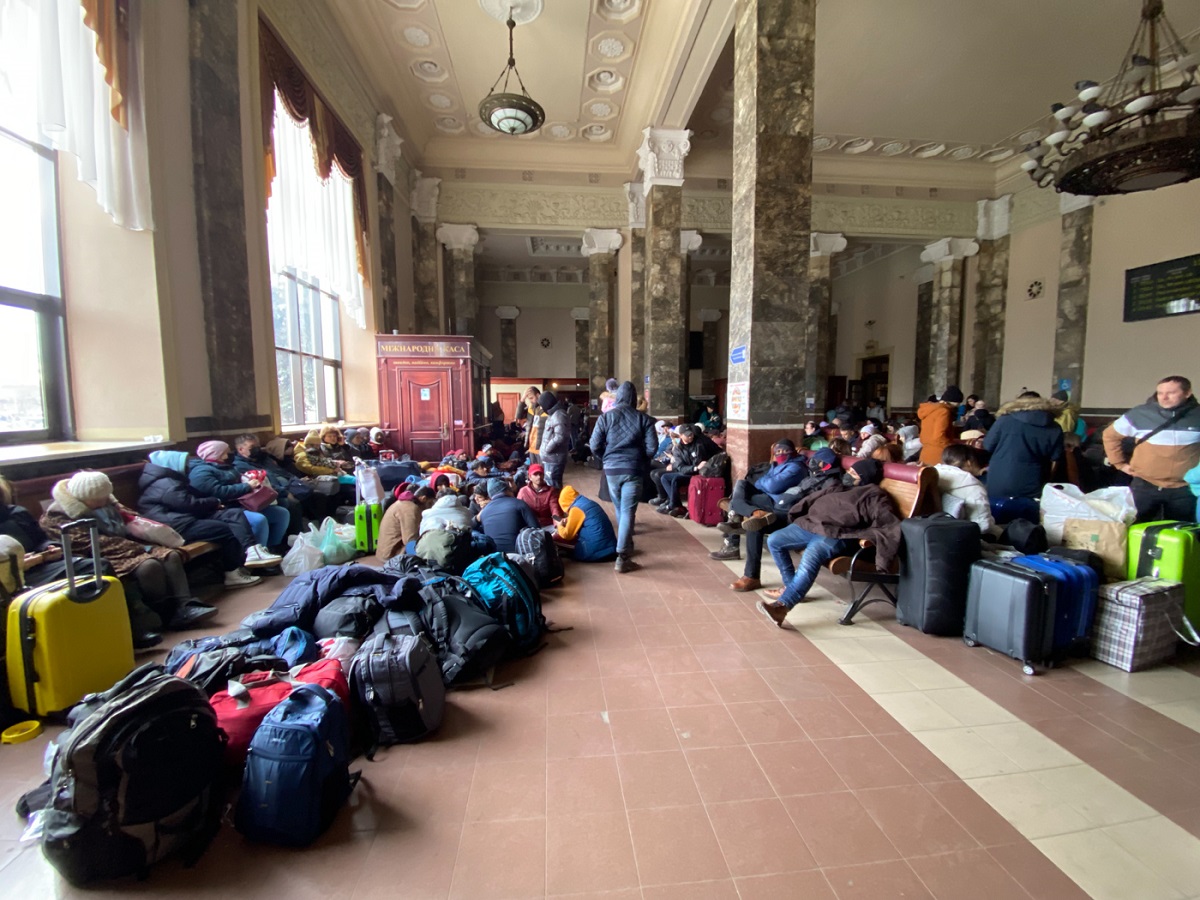 Людей на железнодорожном вокзале во Львове было очень и очень много. Женщин с детьми провожали мужья и отцы. Беженцы из Азии и Африки были напуганы, кажется, больше всех — многие не говорили ни на русском, ни на украинском языке, понять, что происходит, им было сложно.