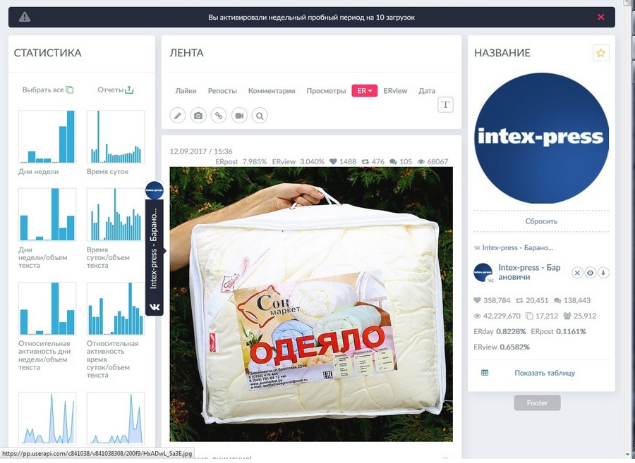 Калі паглядзець статыстыку Intex-press па VKon­tak­te праз Popsters.ru, можна даведацца, што самы высокі ER (амаль 8 %) за ўвесь час існавання суполкі быў у допіса пра розыгрыш коўдры.