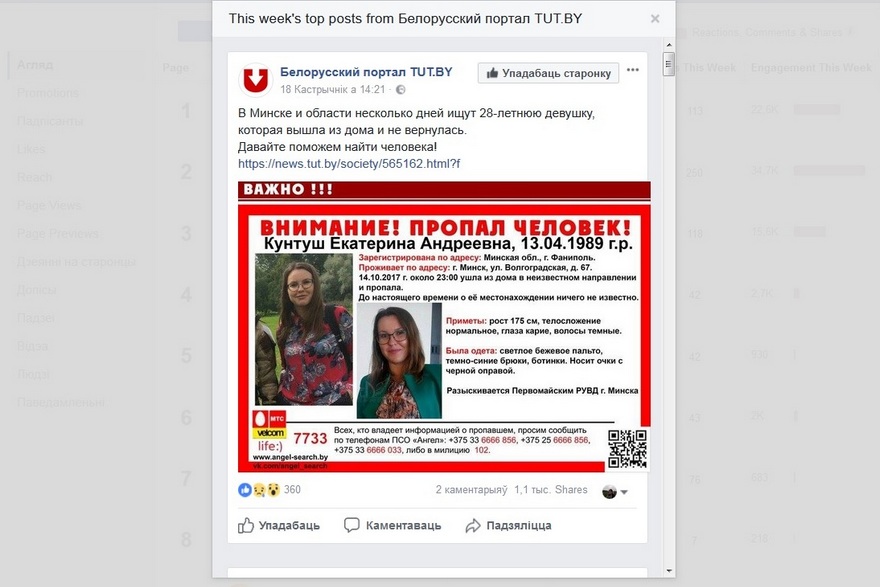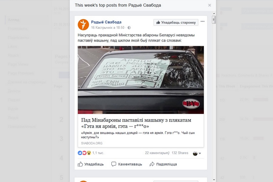 Для старонак Face­book, якія набралі больш за 100 лайкаў, дасяжная функцыя “Цікавыя старонкі” ў меню статыстыкі. Туды трэба дадаць не менш за 5 “чужых” старонак, і націснуць “сачыць”. Акрамя колькасці рэакцый на пасты можна даведацца, якія допісы былі самымі папулярнымі за апошні тыдзень.