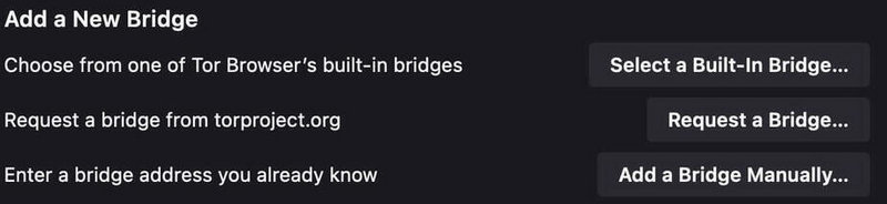 Калі падлучыцца адразу не ўдалося, то ў браўзеры TOR ёсць убудаваная функцыя «мастоў», якія дазваляюць вам дагрукацца да сеткі. Калі ў вас будуць праблемы з падключэннем, то TOR сам прапануе абраць мост, які дапаможа злучыцца з сеткай. Для гэтага націсніце «Configure connection». Спусціцеся ў меню троху ніжэй, да ўкладкі «Add a new bridge».