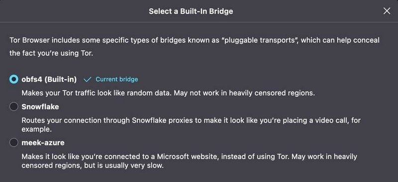 Пасля гэтага націсніце «Select a build-in bridge». Паспрабуйце замест obfs4 абраць іншы — да прыкладу, Snowflake, і перападключыцца.