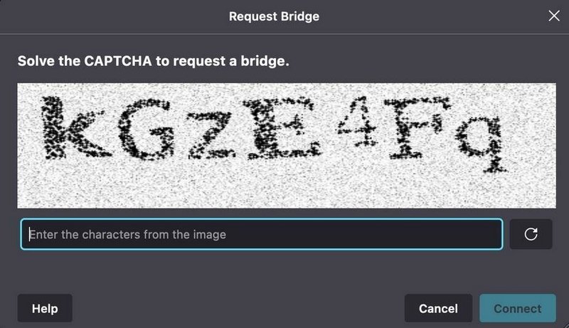 Калі гэта не спрацавала, то націсніце «Request a bridge», увядзіце капчу і паспрабуйце атрымаць «мост» праз убудаваны сэрвіс.