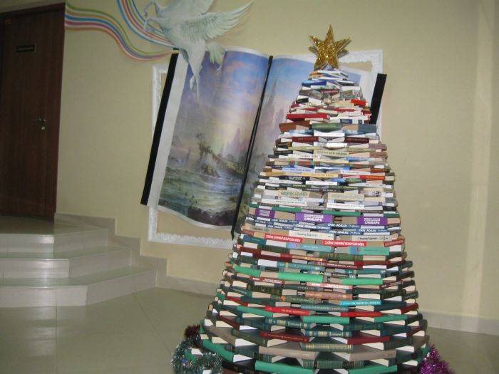 Супрацоўнікі бібліятэкі ў сваім холе склалі навагоднюю ялінку з рознакаляровых кніг. Бліжэй да кніжнай вершаліны ў ялінку пакладзены і дзве кнігі Святланы Алексіевіч у белых вокладках – дзве “Чарнобыльскія малітвы”.